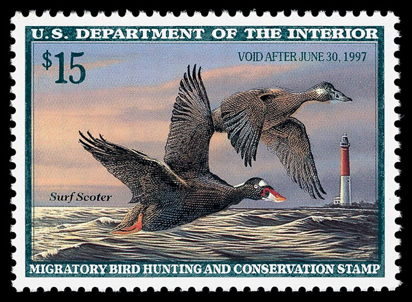 5541 nh RW63 imageFederal Duck Stamp, 1996, $15 Surf Scoters (Scott RW63), o.g., never hinged, Superb, with 2005 P.S.E. certificate graded SUP 98.