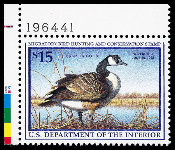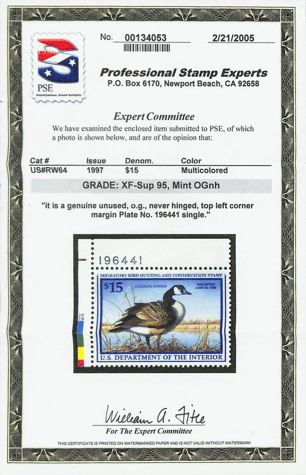 5542 nh RW64 imageFederal Duck Stamp, 1997, $15 Canada Geese (Scott RW64), plate number single, o.g., never hinged, Extremely Fine to Superb, with 2005 P.S.E. certificate graded XF-SUP 95.