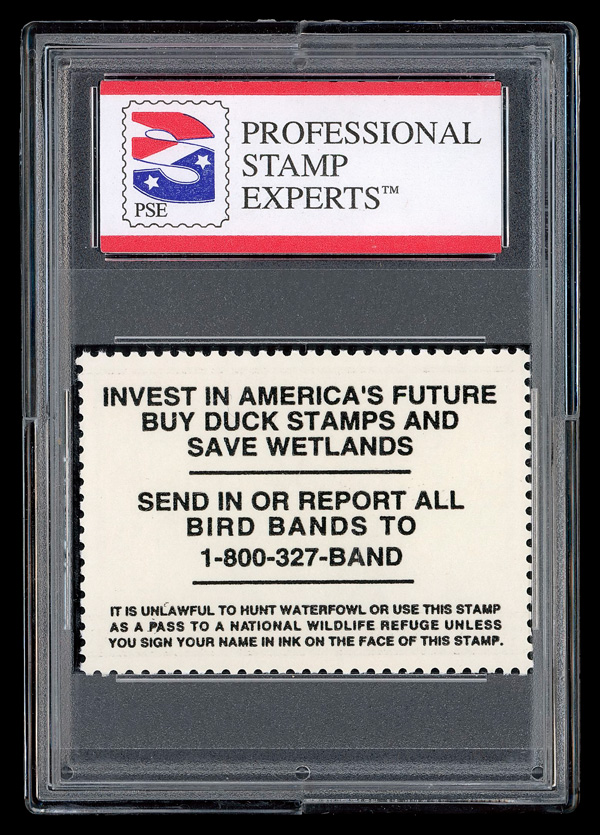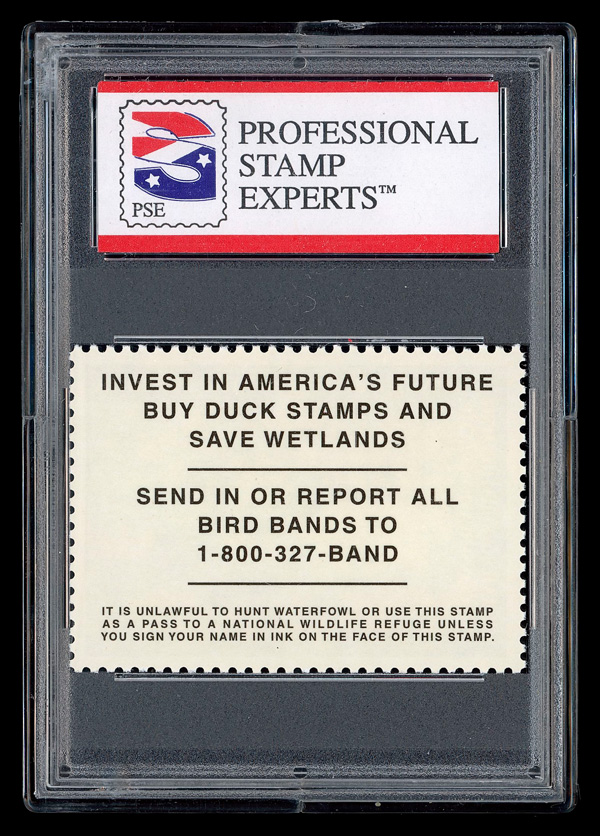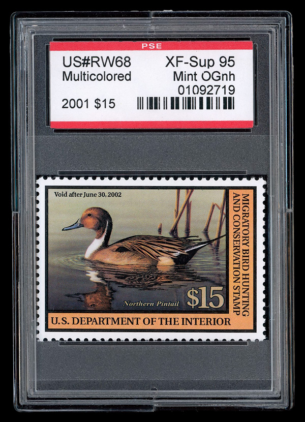 5545 nh RW68 imageFederal Duck Stamp, 2001, $15 Northern Pintail (Scott RW68), o.g., never hinged, Extremely Fine to Superb, with P.S.E. encapsulated certificate graded XF-SUP 95.