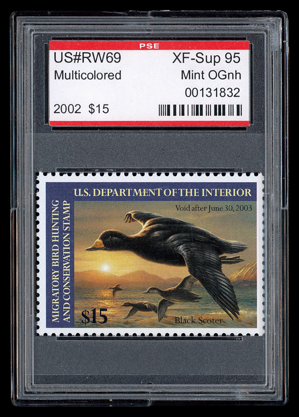 5546 nh RW69 imageFederal Duck Stamp, 2002, $15 Black Scoters (Scott RW69), o.g., never hinged, Extremely Fine to Superb, with P.S.E. encapsulated certificate graded XF-SUP 95.