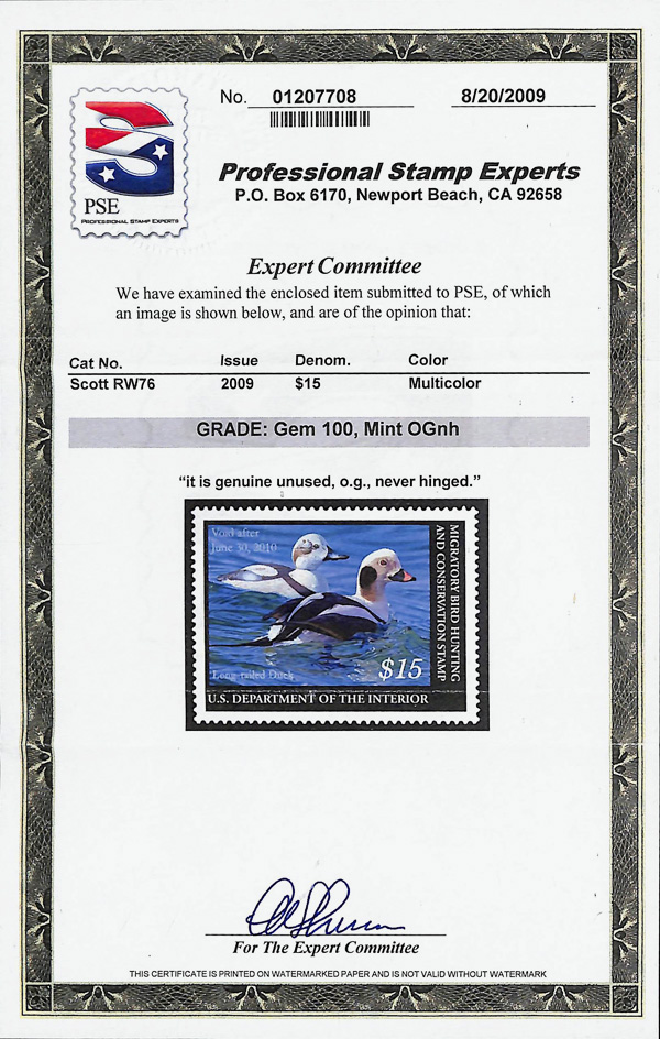 5553 nh RW76 imageFederal Duck Stamp, 2009, $15 Long-Tailed Duck (Scott RW76), Pure untouched quality, o.g., never hinged, Superb, with 2009 P.S.E. certificate graded GEM 100.