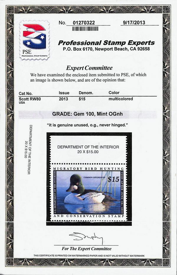5554 nh RW80 imageFederal Duck Stamp, 2013, $15 Common Goldeneye (Scott RW80), Museum-quality freshness, o.g., never hinged, Superb, with 2013 P.S.E. certificate graded GEM 100.