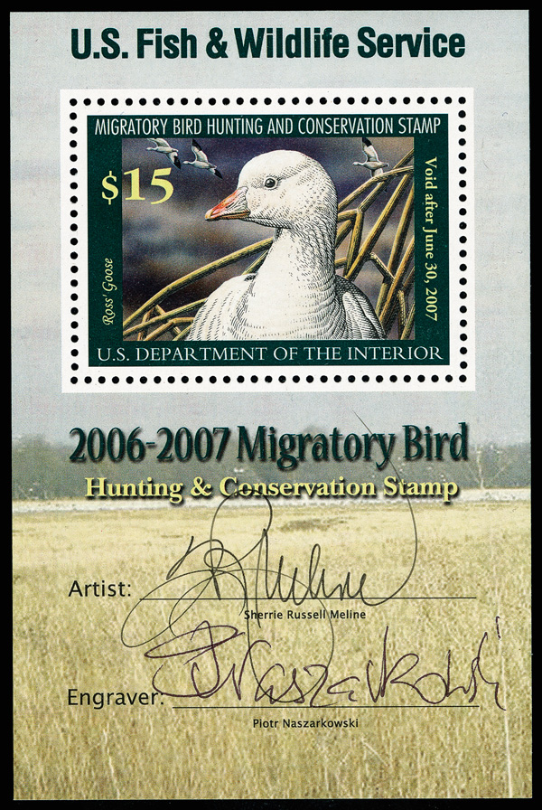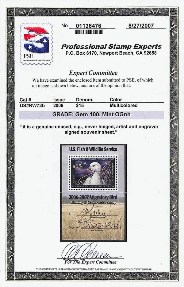 5552 nh RW73b imageFederal Duck Stamp, 2006, $15 Ross's Goose, souvenir sheet of 1 (Scott RW73b), with both signatures and Dumaine cert, o.g., never hinged, Superb, with 2007 P.S.E. certificate graded GEM 100.