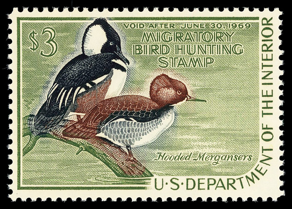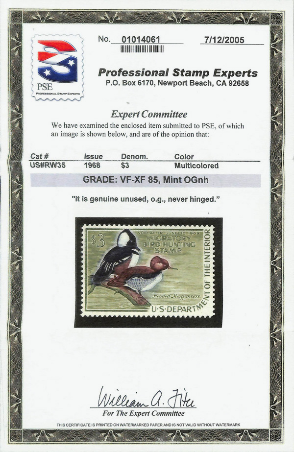 5521 nh RW35 imageFederal Duck Stamp, 1968, $3 Hooded Mergansers (Scott RW35), o.g., never hinged, Very Fine to Extremely Fine, with 2005 P.S.E. certificate graded VF-XF 85.