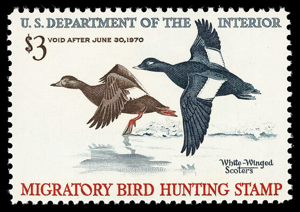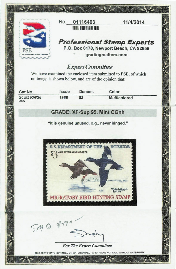 5522 nh RW36 imageFederal Duck Stamp, 1969, $3 White-Winged Scoters (Scott RW36), o.g., never hinged, Extremely Fine to Superb, with 2014 P.S.E. certificate graded XF-SUP 95.
