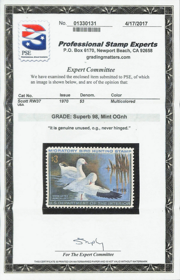 5523 nh RW37 imageFederal Duck Stamp, 1970, $3 Ross's Geese (Scott RW37), o.g., never hinged, Superb, with 2017 P.S.E. certificate graded SUP 98.