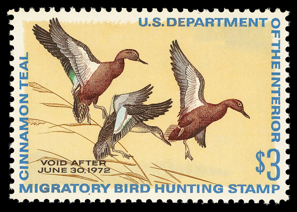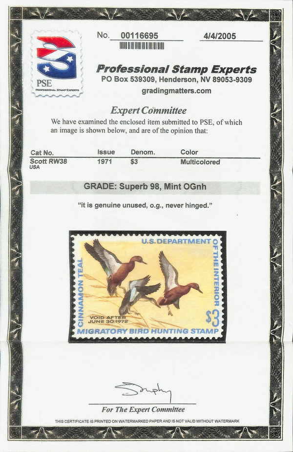 5524 nh RW38 imageFederal Duck Stamp, 1971, $3 Cinnamon Teals (Scott RW38), o.g., never hinged, Superb, with 2005 P.S.E. certificate graded SUP 98.