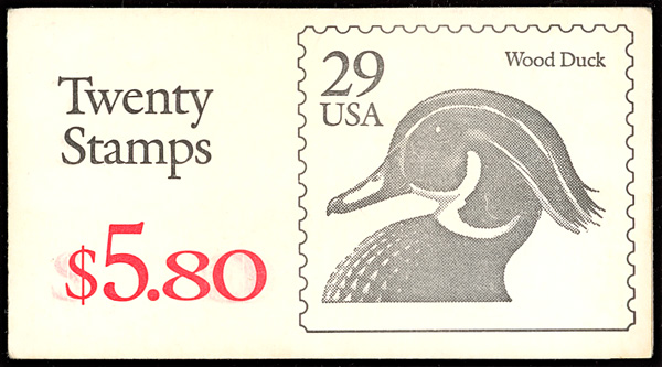5579 BKnh BK174b image1991, 29¢ Wood Duck, black "29 USA", imperforate between, complete booklet (Scott BK174b), complete unexploded booklet, o.g., never hinged, fresh and sound, containing two #2484f panes of ten with horizontal perforations strongly misplaced to top (as per Scott), cover showing ghosting of red value, Very Fine.
