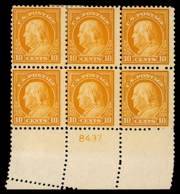 5578 ogbl 510 var. image1917, 10¢ orange yellow, perf. 11, pre-perforating fold-over (Scott 510 var.), bottom margin block of 6 with plate number, fold-over created "crazy perfs"; plate number 8437; bright color on clean paper, o.g., hinge remnant (natural gum creases), Fine to Very Fine. (Image) Suggested Bid $105