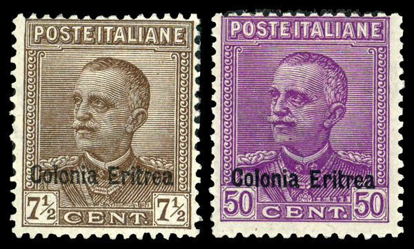5577 og 105-106 image1928-1929, Victor Emmanuel III, 7½c light brown and 50c dull violet complete (Scott 105-106), complete set of singles, o.g., hinged, Fine to Very Fine.