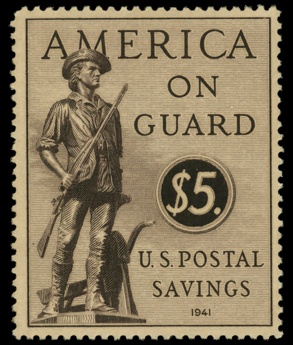 5563 nh PS15 imagePostal Savings, 1941, $5 sepia (Scott PS15), o.g., never hinged, Very Fine to Extremely Fine.