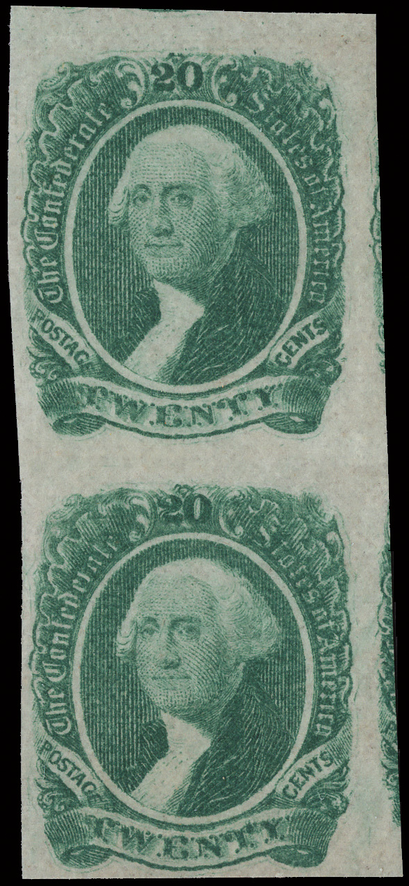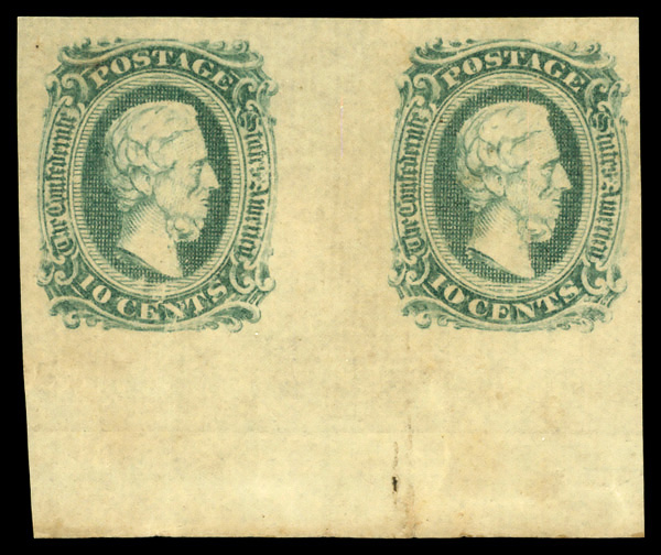 5589 nh 11d image1863, 10¢ green (Scott 11d), bottom margin horizontal pair with gutter between, o.g., never hinged, Superb.