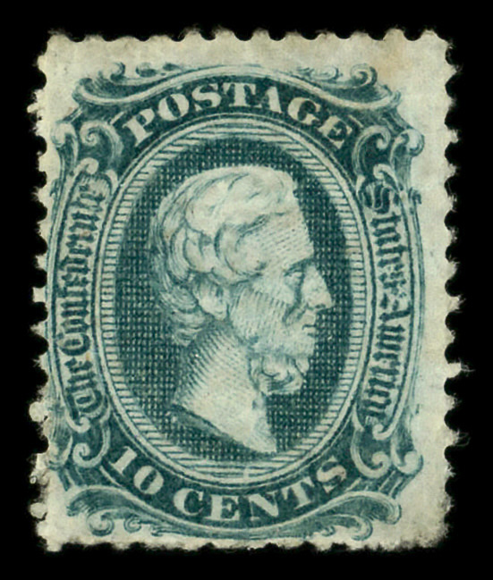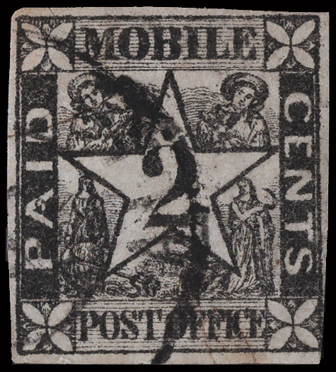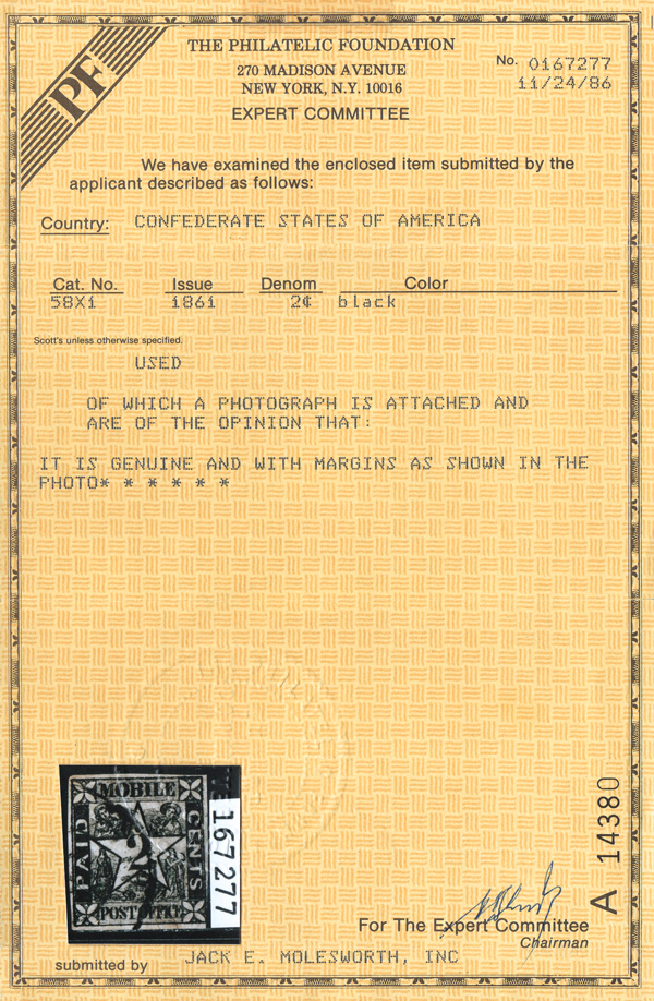 5582 O 58X1 imageMobile, Ala., 1861, 2¢ black (Scott 58X1), small margins to barely shaved at the lower right, partial black c.d.s. cancel, Fine, with a 1986 P.F. certificate.