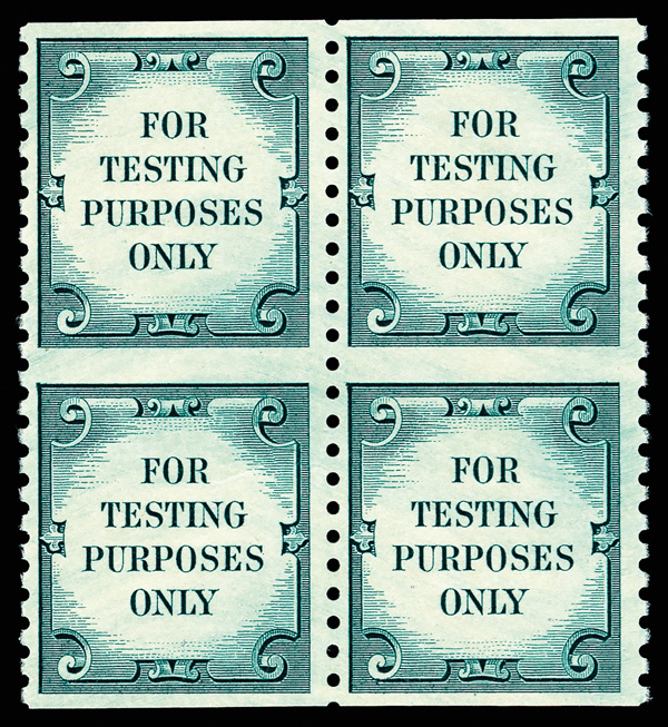 5570 ngbl TD109b imageTest Stamp, 1980, B.E.P. "For Testing Purposes Only", green, untagged, dull gum, imperf horizontally (Scott TD109b), vertical block of 4, unused without gum, Very Fine.
