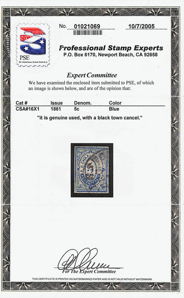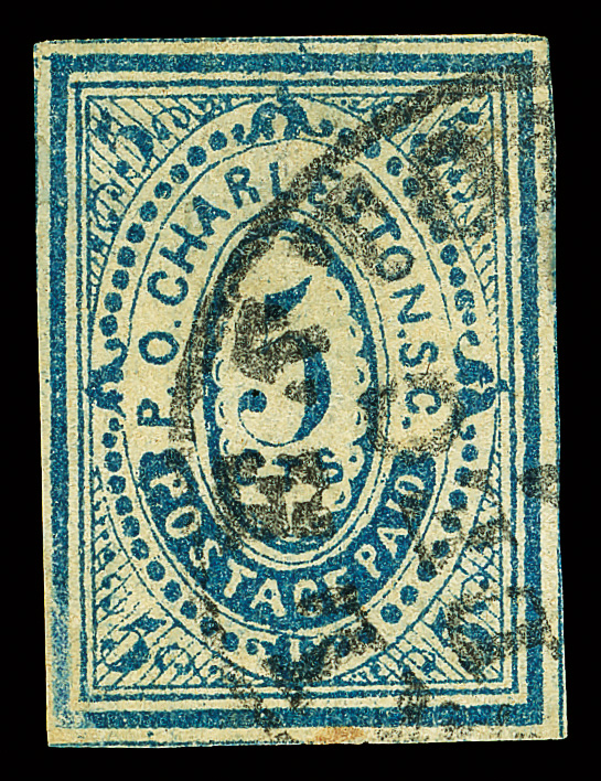 5581 O 16X1 imageCharleston, S.C., 1861, 5¢ blue (Scott 16X1), Balanced all around, black town cancel, Very Fine, with 2005 P.S.E. certificate.