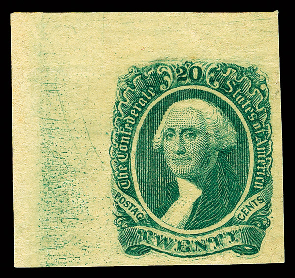 5595 og 13 image1863, 20¢ green (Scott 13), corner margin single, Strikingly balanced margins, o.g., lightly hinged, Superb.