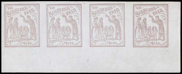 5572 ng WV14 imageSanitary Fair, Springfield, Mass., 1864, 10¢ lilac (Scott WV14), horizontal strip of 4 with right & bottom sheet margins, unused without gum.