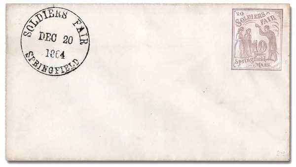 5573 cover WV14 imageSanitary Fair, Springfield, Mass., 1864, 10¢ lilac (Scott WV14), cut close all around (as are virtually all on-cover examples), on an unaddressed cover with Fair postmark, Dec 20, 1864, Very Fine.