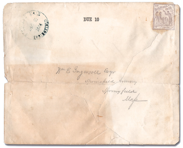5574 cover WV14 footnote imageSanitary Fair, Springfield, Mass., 1864, 10¢ lilac (Scott WV14 footnote), cut close all around, as always; on a large cover (about 8" x 6¼"), pencil-addressed to "Wm E Ingersoll Esqr, Springfield Armory, Springfield, Mass.;" partial blue Fair c.d.s., Dec 20, 1864, and small handstamped "DUE 10"; heavy horizontal crease, multiple repaired tears and slight toning; nonetheless, an apparently unique cover. Scott notes the value as "slightly more than an unaddressed cover." (Image) (Image2) (All Images)