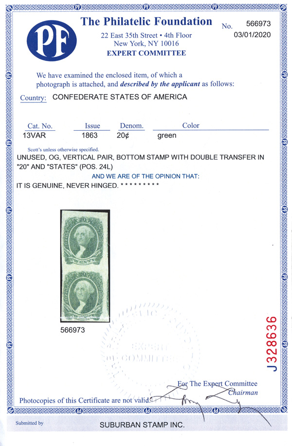 5594 nh 13 image1863, 20¢ green, double transfer (Scott 13 var.), the bottom stamp in a vertical pair (positions 14/24), o.g., never hinged, fresh and Very Fine, with a 2020 P.F. certificate.