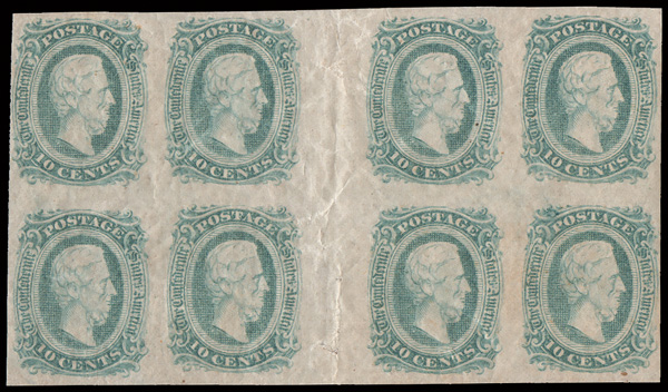 5588 nhbl 11 image1863, 10¢ blue (Scott 11), horizontal block of 8 with central vertical gutter, o.g., never hinged, quite fresh with four margins (close on the sides, not affecting the gutter block of 4); lightly creased through the gutter, Fine to Very Fine.
