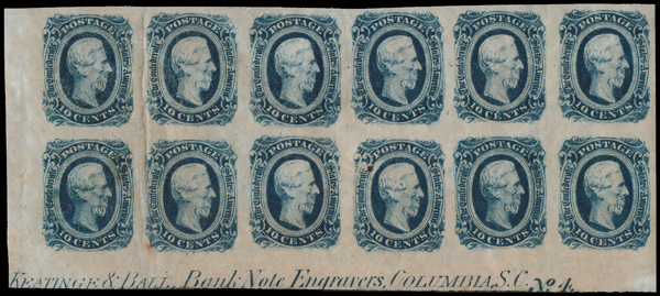 5593 nhbl 12 image1864, 10¢ deep blue, Keatinge & Ball printing (Scott 12 var.), Plate No. 4 block of 12, o.g., never hinged, exceptionally fresh with large margins all around; vertical crease along left edge of the stamps in the 2nd column, otherwise Very Fine.