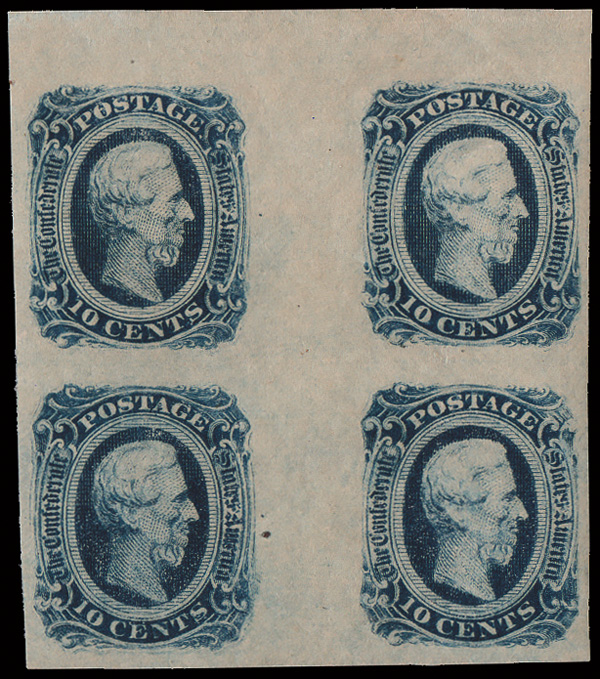 5592 nhbl 12 image1863, 10¢ blue (Scott 12), a choice top margin gutter block of 4, o.g., never hinged, exceptionally fresh with large margins, Very Fine.