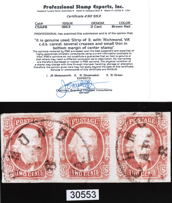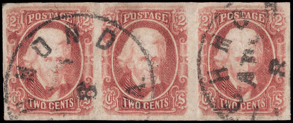 5587 O 8 image1863, 2¢ brown red (Scott 8), a pretty used horizontal strip of 3, fresh and large-margined with neat Apr 8 Richmond c.d.s.s; several light creases and a tiny thin, Very Fine appearance. A most attractive multiple., with a 1997 P.S.E. certificate.