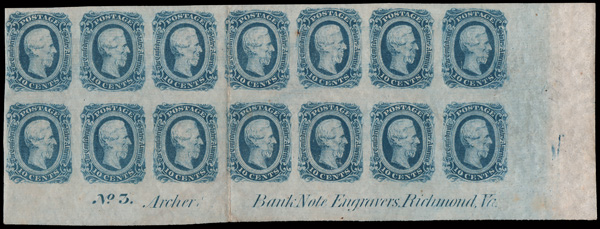 5591 nhbl 12 image1863, 10¢ blue (Scott 12), lower right corner Plate No. 3 Archer ("Daly" removed) block of 14, o.g., never hinged, fresh color, margin just clear at the left; tiny tone spot, vertical crease along left edge of the stamps in the 4th column, Very Fine.