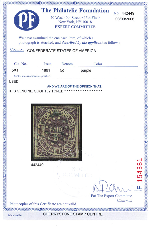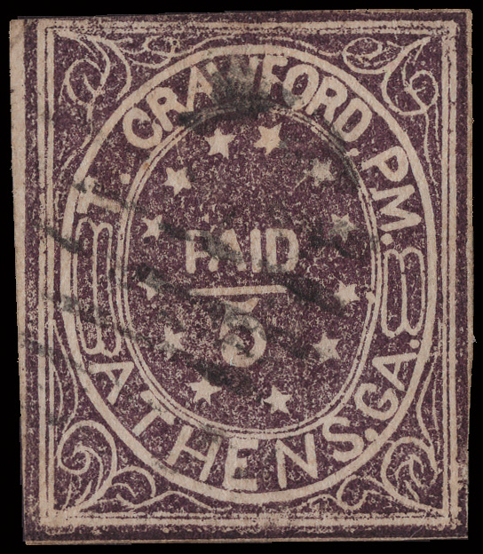 5580 O 5X1 imageAthens, Ga., 1861, 5¢ purple (Scott 5X1), neat grid cancel, margins clear to just in at the upper left; slightly toned, otherwise Fine, with a 2006 P.F. certificate.