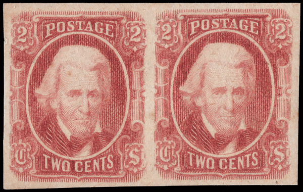 5586 nh 8 image1863, 2¢ brown red (Scott 8), a choice horizontal pair, o.g., never hinged, exceptionally fresh with ample, well balanced margins, Very Fine.