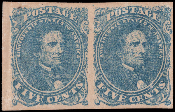 5585 nh 4 image1862, 5¢ light blue (Scott 4), a pretty horizontal pair with partial left sheet margin, o.g., never hinged; light vertical crease along the edge of the left stamp, paper just a bit toned, otherwise Very Fine.