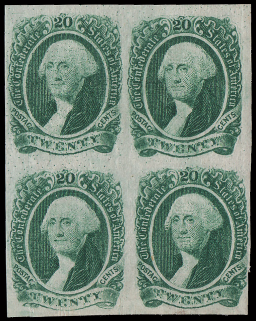 5596 nh/ogbl 13 image1863, 20¢ green (Scott 13), a frsh, attractive block of 4, o.g., top stamps never hinged, clear to large margins; faint diagonal bend, Fine to Very Fine.