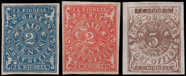5583 ng 62X1, 62X2, 62X5 imageNew Orleans, La., 1861, 2¢ blue, 2¢ red, and 5¢ yellow brown (Scott 62X1, 62X2, 62X5), without gum as issued, all fresh and bright with four nice margins, Very Fine.