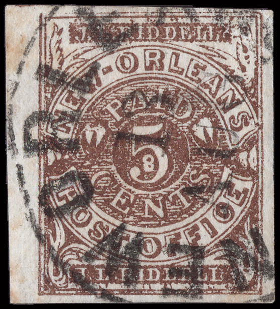 5584 O 62X5 imageNew Orleans, La., 1861, 5¢ yellow brown on off-white (Scott 62X5), ample to oversize margins with a clear partial New Orleans c.d.s., Very Fine.