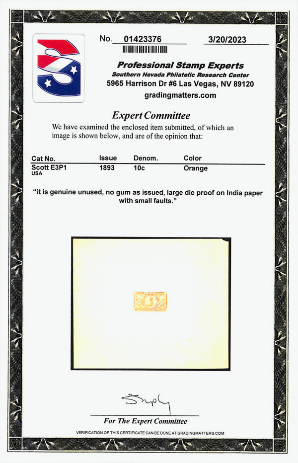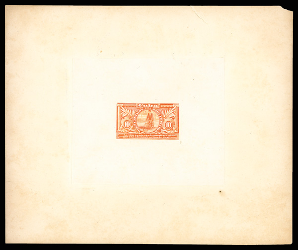 5636 P E3P1 imageSpecial Delivery, 1902, 10c orange, re-engraved ("Inmediata"), plate proof on India (Scott E3P1), sharp impression with bold color, India measuring 88 x 75mm, die-sunk on 167 x 139mm card; card toned and with small faults, Fine to Very Fine, with 2023 P.S.E. certificate.