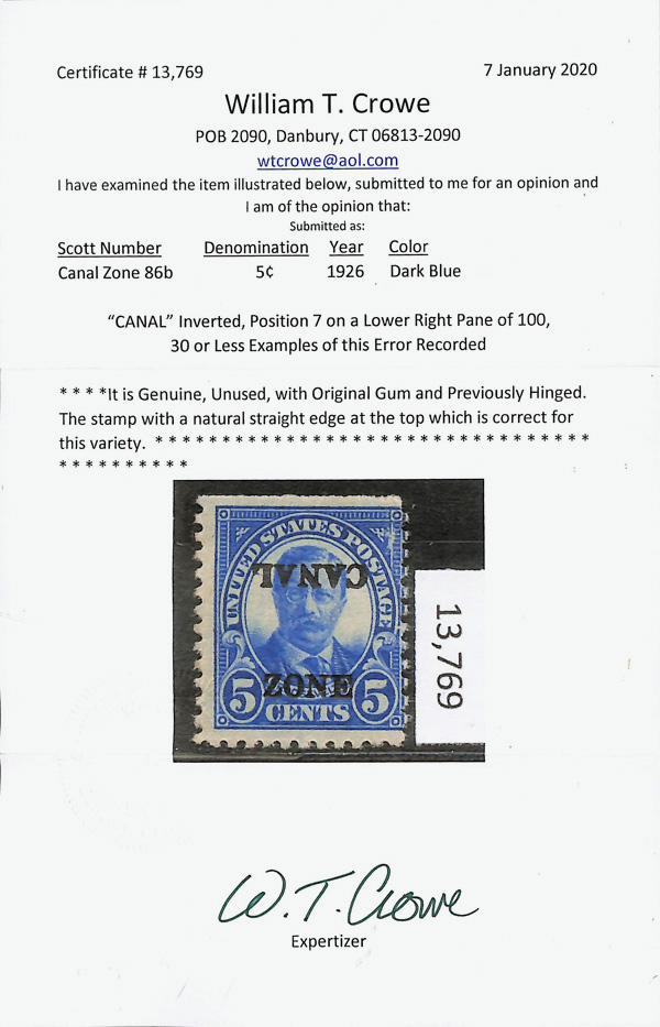 5619 og 86b image1926, 5¢ Theodore Roosevelt, sharp "A", "CANAL" inverted (Scott 86b), from position 7 of the sheet with a natural straight edge at top, as usual for this variety, o.g., previously hinged, Very Good, only 30 or less of this error recorded, with 2020 Crowe certificate.