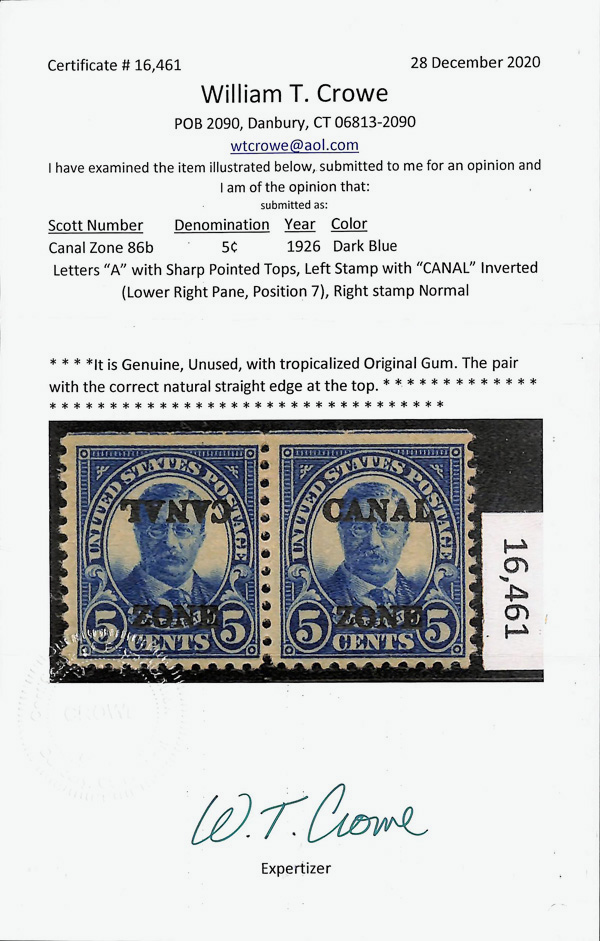 5618 og 86b image1926, 5¢ Theodore Roosevelt, sharp "A", "CANAL" inverted (Scott 86b), pair with normal stamp at right, error comes from position 7 of the sheet with a natural straight edge at top, as usual for this variety, tropicalized o.g., Fine, only 30 or less of this error recorded, with 2020 Crowe certificate.