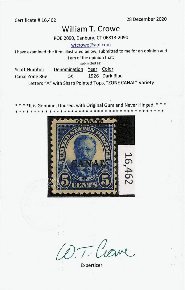 5620 nh 86e image1926, 5¢ Theodore Roosevelt, sharp "A", "ZONE CANAL" (Scott 86e), Very scarce overprint variety, o.g., never hinged, Fine, with 2020 Crowe certificate.