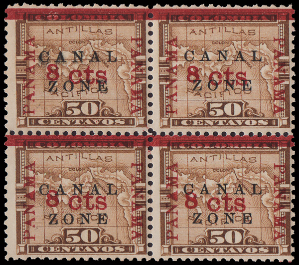 5602 nhbl 14 image1904, 8¢ on 50c Map, bister brown (Scott 14), a wonderfully fresh mint block of 4, o.g., never hinged, Fine to Very Fine.