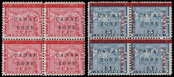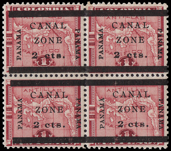 5603 nh/ogbl 17b image1904, 2¢ on 1p Map, lake, surcharge type "f" (Scott 17b), a pristine, beautifully centered block of 4, o.g., bottom stamps never hinged (top lightly hinged), Extremely Fine.