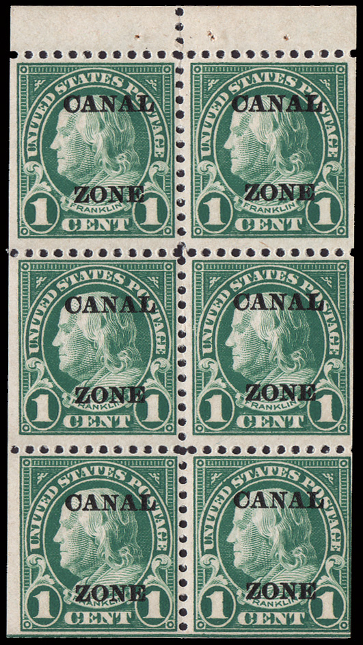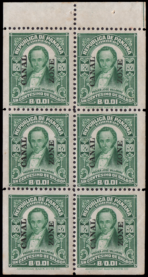 5607 BKog 52b image1918, 1c Balboa, green & black, type IV overprint, booklet pane of 6 (Scott 52b), tropicalized o.g., quite well centered; but lightly toned, otherwise Very Fine.
