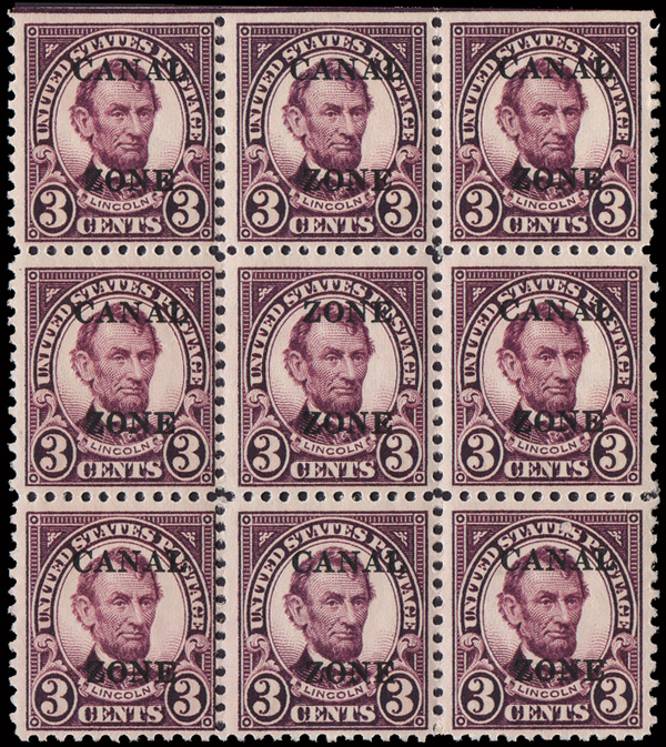 5617 ogbl 85a image1925, 3¢ Lincoln, sharp "A", "ZONE ZONE" (Scott 85a), the middle stamp block of 9 from the top of a bottom pane of 100, tropicalized o.g., unusually bright and fresh, Fine to Very Fine.