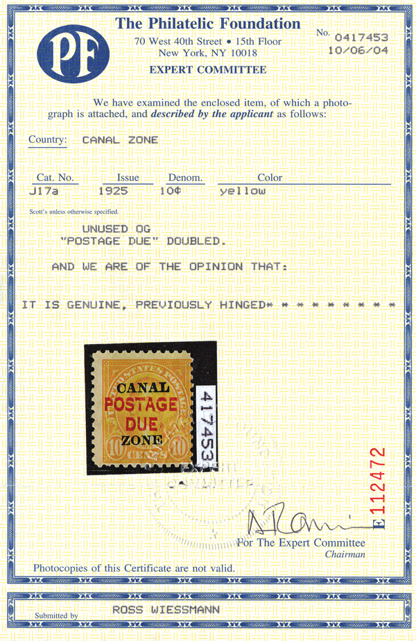 5630 og J17a imagePostage Due, 1925, 10¢ orange, "POSTAGE DUE" double (Scott J17a), second impression only slightly misplaced vertically, as always, o.g., barely hinged, wonderfully bright and fresh, Fine, with a 2004 P.F. certificate.