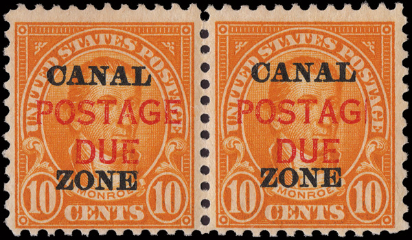 5631 og J17b imagePostage Due, 1925, 10¢ orange, missing "E" of "POSTAGE" (Scott J17b), the right stamp in a horizontal pair,penceled positions 82-83 on the reverse, lightly tropicalized o.g., exceptionally fresh with gorgeous color, Fine to Very Fine.
