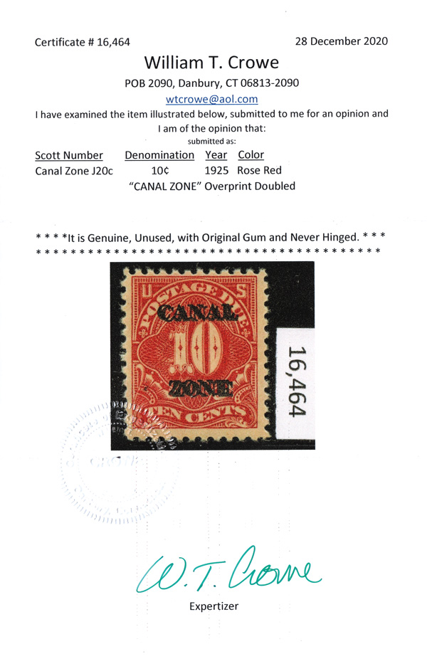 5632 nh J20c imagePostage Due, 1925, 10¢ rose red, double overprint (Scott J20c), an outstanding mint example, o.g., never hinged, wonderfully bright and post office fresh, centered to the top, as usual, but perfs clear of design, Fine to Very Fine. One of the finest of very few never hinged examples extant (only 100 were issued., with a 2020 Crowe certificate.