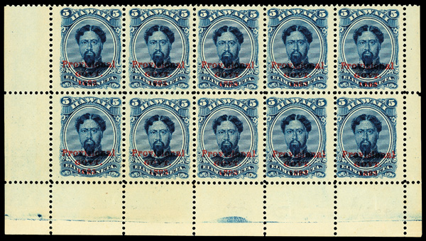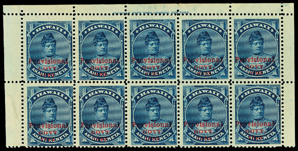 5650 nhbl 54 image1893, Provisional Govt., 1¢ blue, red overprint (Scott 54), top margin inscription block of 10, o.g., never hinged, with deep lines and bold color, position 6 the "no period after 'GOVT'" variety (#54b); small hole at top right of position 3, Fine+. (Image) Suggested Bid $160