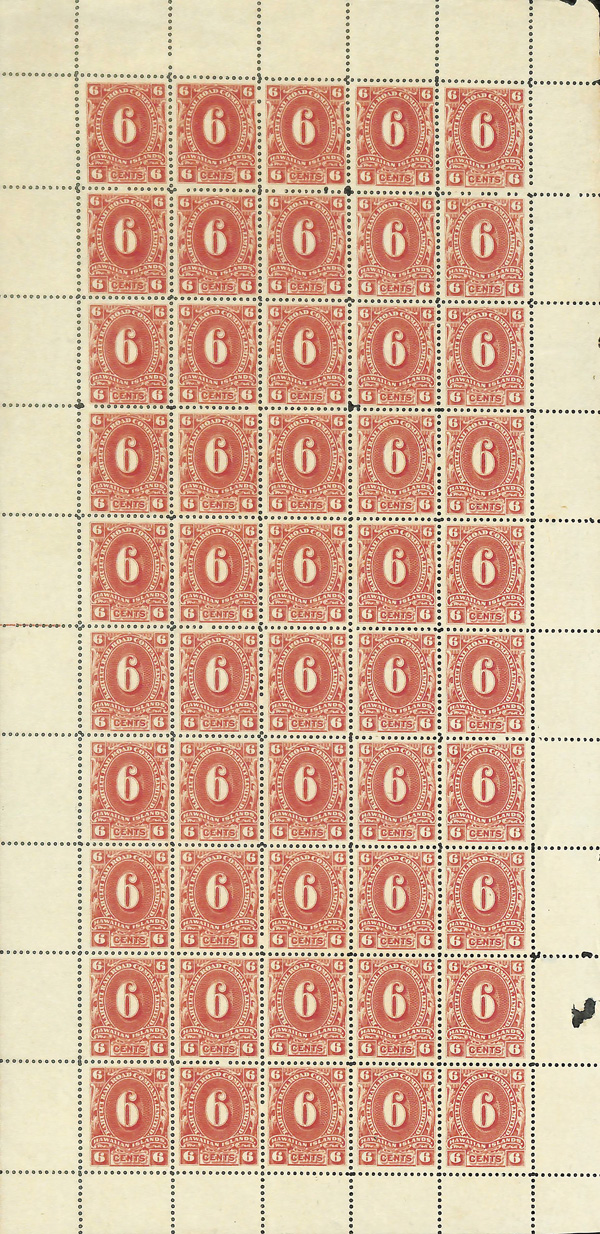5659 ngbl 152 imageKahului Railroad, 1894, 6¢ red, full pane of 50, without gum as issued, with crisp detail in alluring color, paper fresh with perforations intact; damage to one selvage tab on right, Fine to Very Fine.