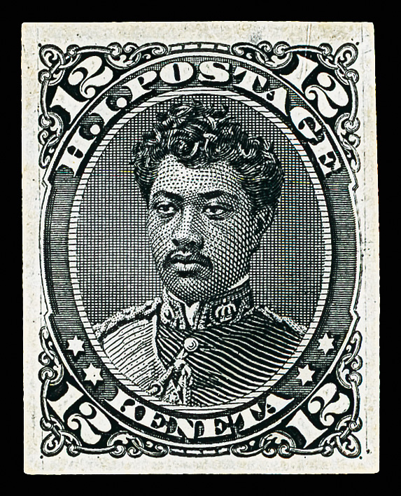 5649 P 36P3 image1875, Prince William Leleiohoku, 12¢ black, plate proof on India paper (Scott 36P3), deeply engraved yielding profound color and clear detail, full margins all around; small thins, pinhole along outer frame line above "T" of "POSTAGE", Very Fine appearance.