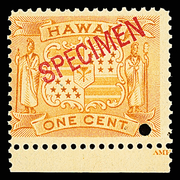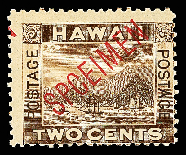 5653 Snh 75 image1894, View of Honolulu, 2¢ brown, "SPCEIMEN" overprint error (Scott 75), position UL8, o.g., never hinged, an enticing item, cleanly printed and sound with fresh full gum; partial "N" of adjacent overprint at upper left; no security punch, Fine, unlisted in Scott. (Image) Suggested Bid $130